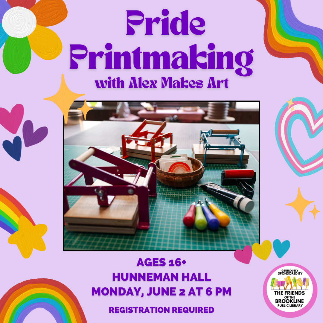 Join Alex Makes Art at the Public Library of Brookline to kick-off Pride with a fantastic printmaking experience! Whether you’re a seasoned printmaker or just want to learn the basics, this event is all about unleashing your creativity. We’ll provide all the necessary equipment—just bring your imagination (and maybe a friend or two)! All are welcome.