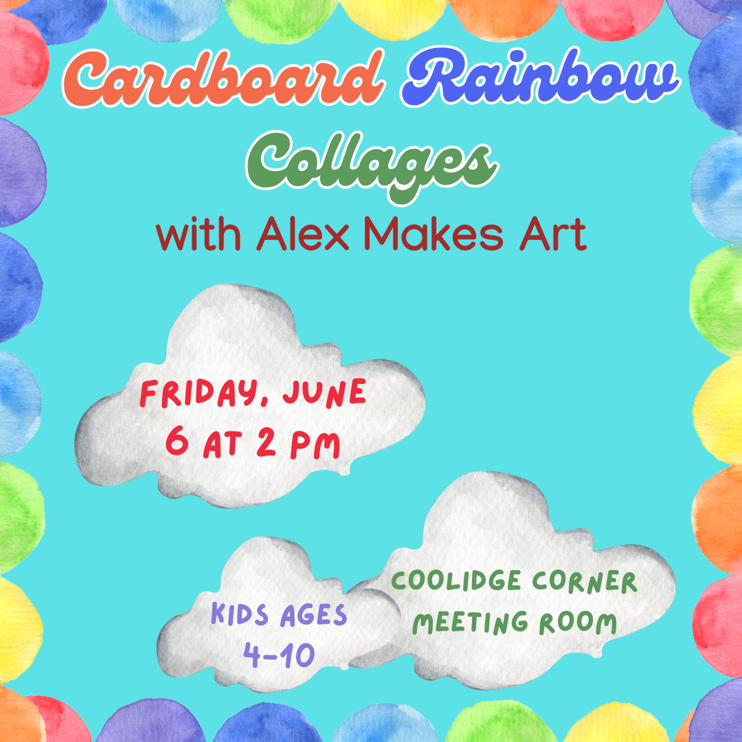 Kids ages 4-10 and accompanying siblings and grownups are invited to join Alex Makes Art at Coolidge Corner for a joyful afternoon of community crafting! Using recycled cardboard, colorful materials, and mixed media techniques, kids will create their own unique rainbow sculptures. This hands-on activity encourages creativity and exploration, and celebrates Pride Month, individuality, and the idea that everyone belongs - just as they are.