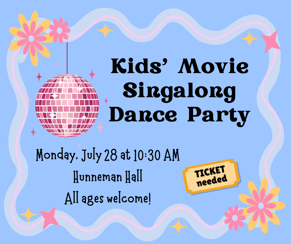 Come sing and dance along to songs from your favorite movies led by children's librarian Emma! This program is for kids of all ages. This is a ticketed event. Tickets will be available at the Children's Desk 30 minutes before the program.