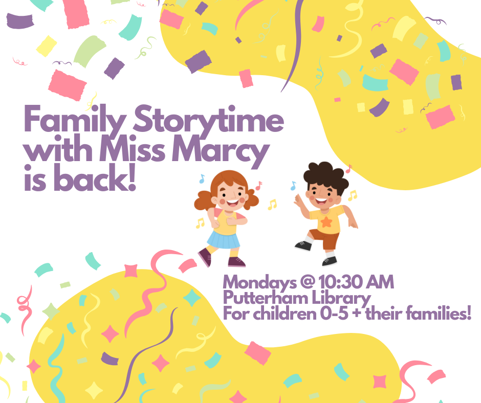 Join us at the Putterham Library on Monday mornings for interactive stories, songs, and movement with Miss Marcy. Be prepared to sing, dance, and shake your sillies out! This program is designed for children ages 0-5, but older siblings are more than welcome to attend. 20 children maximum, first come, first served. Please pick up your ticket at the main desk. Thank you!
